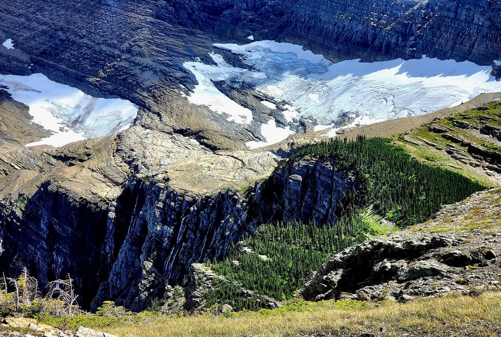 Looking at the Swiftcurrent Glacier. Compared to other glaciers in Glacier National Park, Swiftcurrent Glacier has experienced relatively slow retreat. As of 2005, the glacier had an area of 55 acres, a 14 percent reduction since 1966.