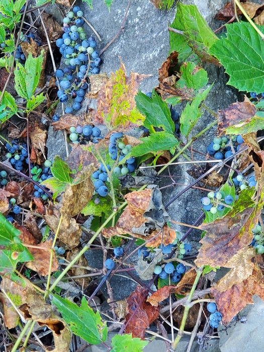 I believe these are grapes. Not 100% sure if they are safe to eat. There is a similar looking berry in this area which is poisonous so be careful.