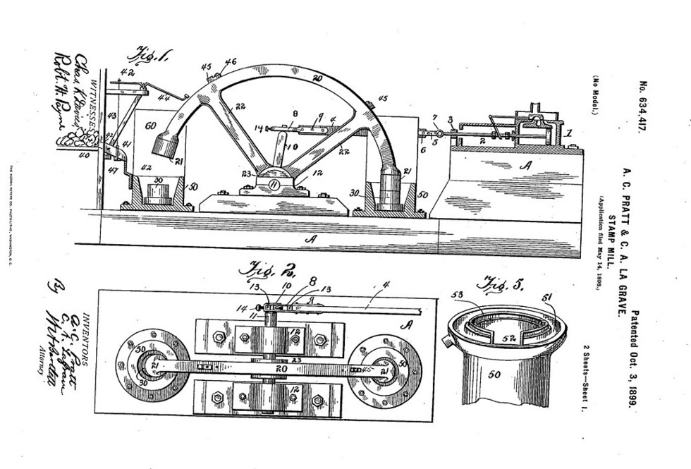 Patent for type of stamp mill at Glines Canyon Mine. I'm not sure what would have driven the piston on the right, perhaps water at high pressure from the pipeline descending the hillside from a creek flowing out of the Par Value Lakes high above. There was what appeared to be a small steam boiler nearby but it seemed small for running an engine and may have been used for some type of gold or silver extraction process.