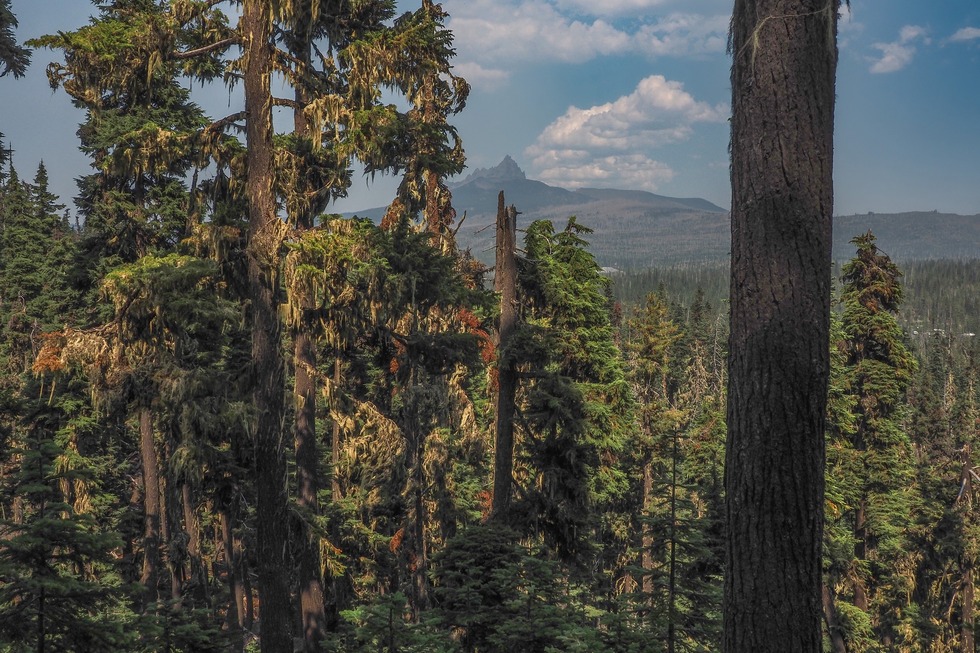 Climbing up the side of Hayrick Butte in thick timber. The peak at photo center is Three Finger Jack.