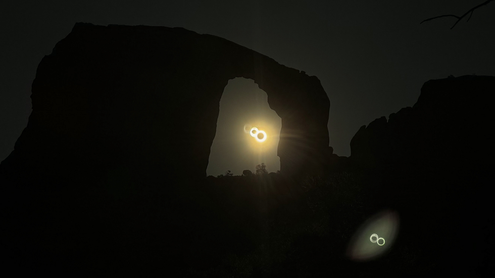 There it is. About 5 minutes of maximum blockage. With only 10% of the sun showing, it was striking to realize just how bright that remaining 10% is. Phone camera through a handheld breakfast snack filter resulted in the lens flare artifacts, which seem pretty cool anyway.