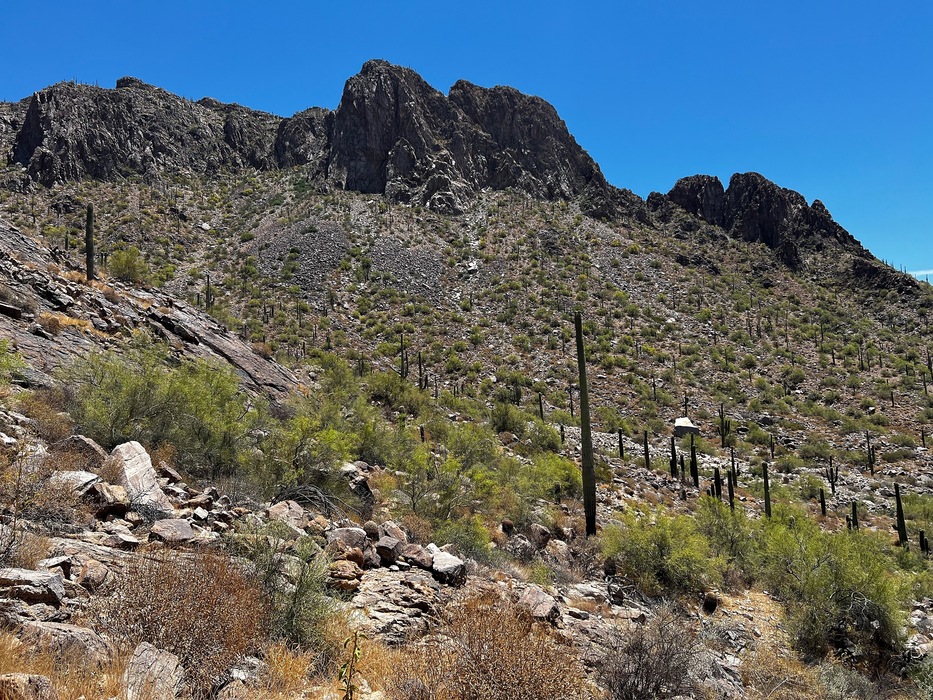 I aimed first at the large white boulder in the center right, where I was able to cool off for a bit, and then up into the shaded crevice just to the left of the prominence in the center top of the photo, from which I accessed the ridgeline.