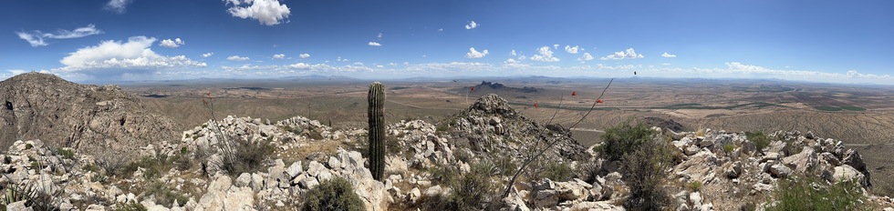 Summit pano modulo the northwest; from left to right are Newman Peak, Mound Mountain and Pinal Peak (either getting pretty heavily rained on or behind the area getting rained on), Mt. Lemmon, Picacho Peak, and Baboquivari Peak way off behind it