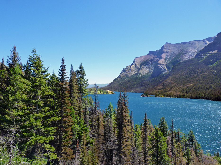 Looking back (east) at St Mary's Lake. The turquoise is caused by glacial silt. At an altitude of 4,484 feet, St. Mary Lake's waters are colder and lie almost 1,500 feet higher in altitude than Lake McDonald. Here, the great plains end and the Rocky Mountains begin in an abrupt five thousand foot altitude change, with Little Chief Mountain posing a formidable southern flank above the west end of the lake. St. Mary lake has a surface area of 3,923 acres. The lake is 9.9 miles long and three hundred feet deep. The waters of the lake rarely rise above 50 °F . During the winter, the lake often is frozen completely over with ice up to four feet thick.