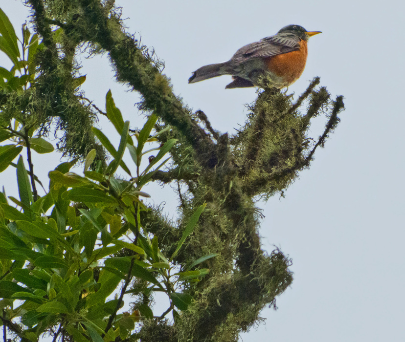 This robin was very loud. I couldn't tell what the bird was until I got this photo home and lightened it up. You can hear it on my video as I think it was singing an opera http://youtu.be/W-9UiOoGQJs . The canopy and understory support an incredible array of life, look for Spanish moss hanging from the tree limbs and listen for songbirds.