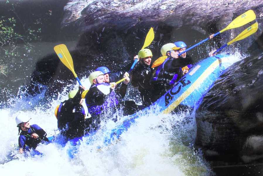 Our big hit on Pillow Rock....Steve-o our guide digs in deep with the rudder. Dean and I throw our paddles up for a smack on Pillow Rock. The guy in the back with blue helmet reached for a smack on the rock, but ended up getting tossed out the side as the boat dropped and the rear spun off.