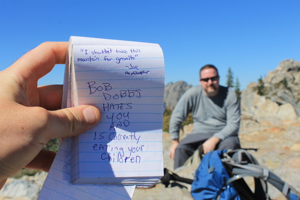 At the summit. There were 2 ammo boxes full of random scraps of paper (old receipts, pages from books, a Zig Zag wrapper...). I reached in, grabbed this notepad, and opened it up to see this. I used to go to this bar in Tucson named Bob Dobbs, but I doubt it hates me.