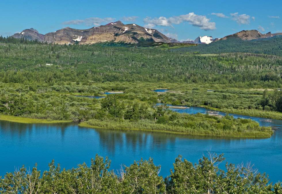 Looking over the far northeast end of Lower St Mary Lake to the west. I think we are looking at East Flattop Mtn and behind that to the left is Going to the Sun Mountain. I'm guessing center background is Siyeh and obviously Old Sun Glacier on Merritt with what I think is Apikuni Mountain in front of it (alongside Many Glacier Road). I would see Merritt on my Belly River hike too.