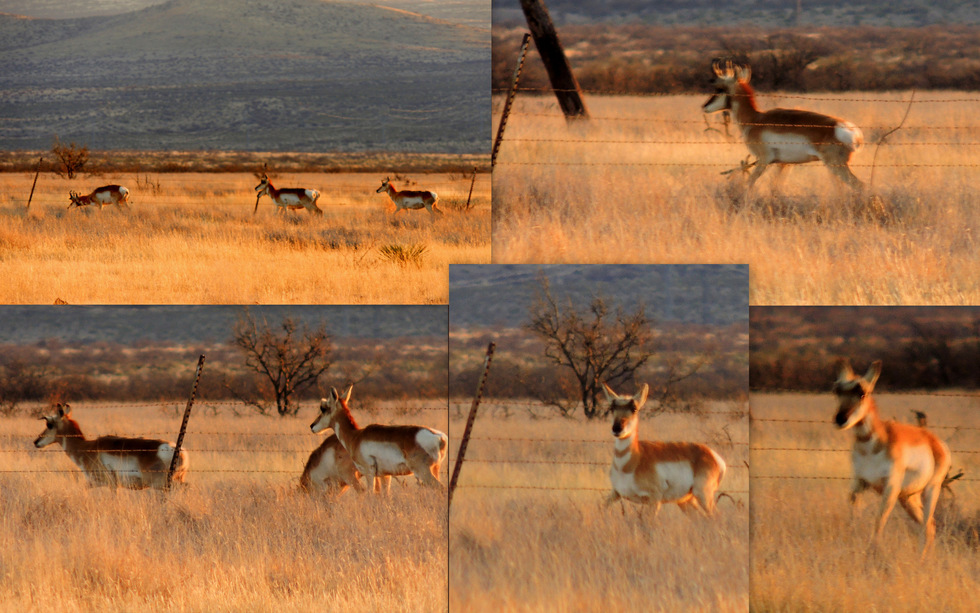 Top: L to R: The Buck starts to go under the Fence and then he's through.....Bottom: L to R: And then another is through with the third getting ready to go under...That leaves Pronghorn #4 and she doesn't like it...So she doesn't go under...But the rest are moving farther away and she starts to panic, running down the Fenceline...She finally gets so desperate...>>>>>>