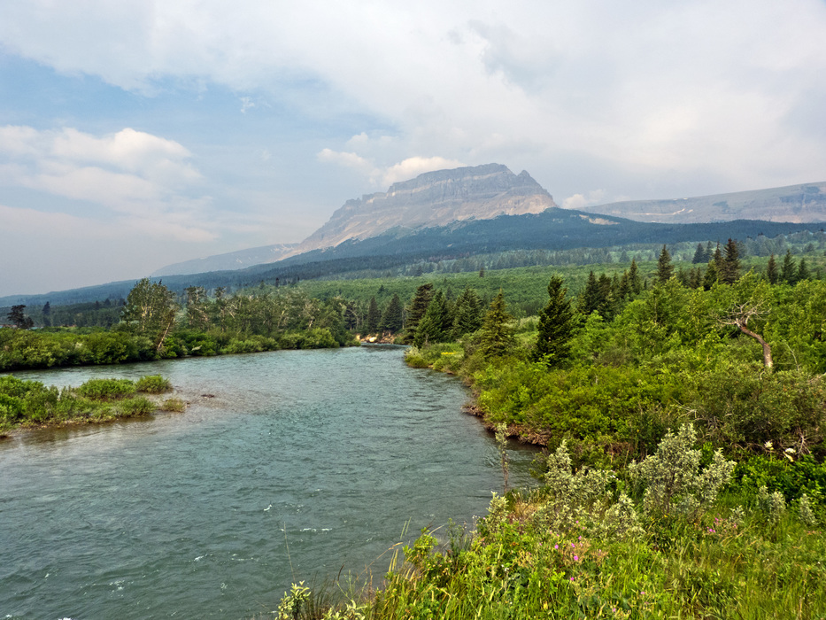 From the stone bridge crossing St Mary Lake causeway as it transcends toward Lower St Mary Lake is this view of Singleshot Mountain thru the smoke.