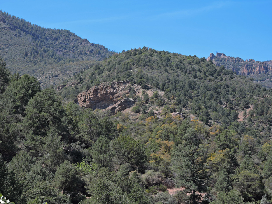 Our destination seen from the road. I wanted to see if there was a visible ruin under the cliff overhang before making the final decision to climb up there. Zooming in on this location showed what looked like a plastered rock wall but couldn't be sure without going up there to take a look.