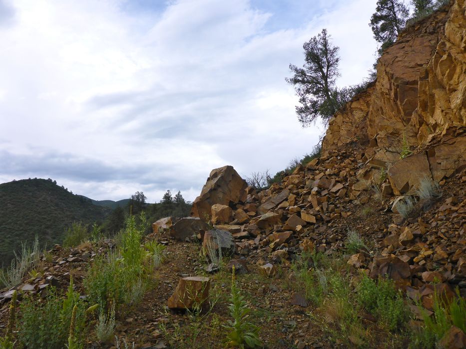 Oh. Guess no one is driving over to R.T.'s claim any time soon. We could have easily bypassed it on foot, but the road curls up and away to the south, and we wanted to go north. Figuring the 200 feet down to the Hassayampa River would be as loose, we decided to backtrack. It turned out to be a very good move.