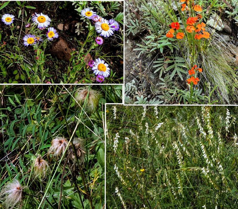 some more flora. I was stoked to see Prairie Smoke though it's on its last stages (LL). Western Wallflower in UR and another shot of that white alpine flower that I don't know what it is off the top of my head and of course some alpine daisy in UL.