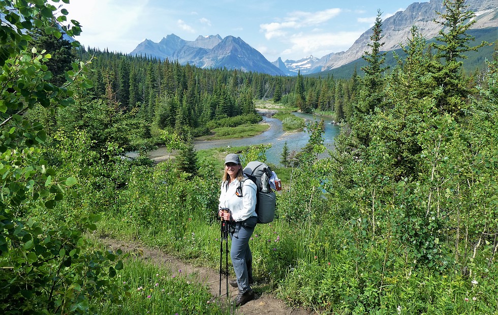 Finally reached our first good view of the Belly River. Behind Tina L to R: Natoas and Merritt with Cosley Ridge in front. To the right of Cosley Ridge is Pyramid, Cathedral and you can kind of see the south side of Stoney Indian. Bear Mountain is to the right. We will be heading south toward Natoas. I do have to tell you, I'm not exactly positive on my mountain ID on the left, so feel free to correct them except for Merritt and Cosley.