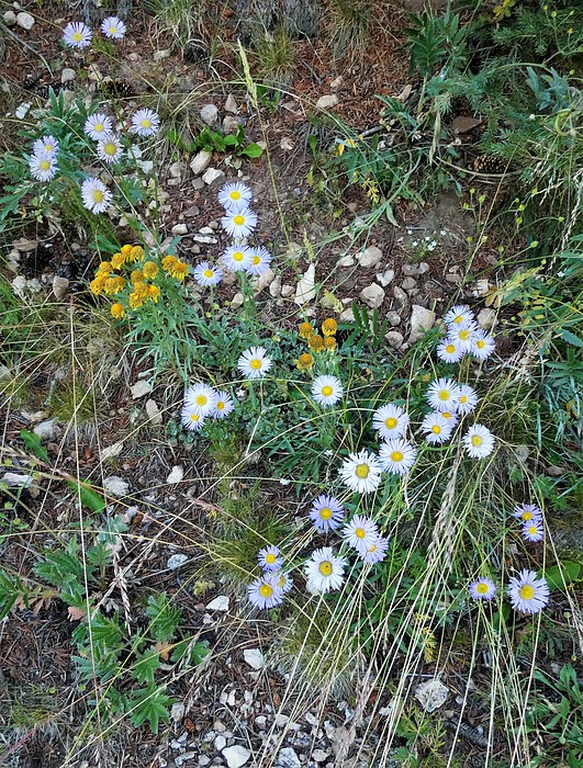 Fleabane (Princely Daisy) here. We would see lots of that scattered about during our hike today but mostly in shady areas. https://www.americansouthwest.net/plant ... simus.html The light purple (occasionally pink or white), narrow ray florets of erigeron formosissimus number between 75 and 150 and are around half an inch in length, surrounding a center of several hundred disc florets, initially greenish, later yellow. The phyllaries underneath the flower heads are green with reddish tips, relatively broad, and glandular - covered by short, sticky hairs. Stems can be smooth but also usually have a covering of hairs. Basal leaves form quite a dense cluster, most pointing upwards; higher up the stems the leaves are shorter, and clasping. All leaves usually have very fine teeth along their edges, and all tend to bend inwards somewhat, along the axis. Stalks often bear just one flower head, but they can have up to 6.