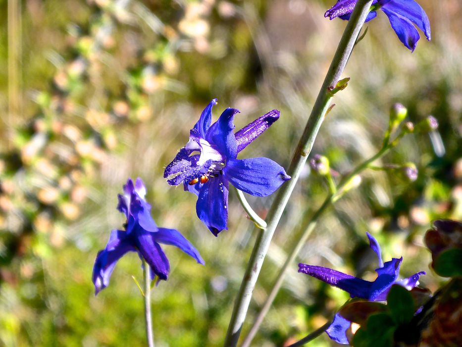 No idea, but they were so deeply purple I audibly gasped when I saw them. Using the [Nearby] tool, I think they are the barestem larkspur @tibber found three years ago, to the day. I was 200 ft. southeast -- or 300 ft. further along Go John Trail -- of where tibber found hers.