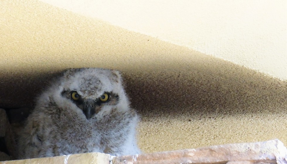 and here's junior; now starting to get more color. Today Matt got a picture of it on the very outside of the ledge. I'm sure it wants to stand up but can't there. We think it will be flying the ledge any time now. They usually work their way to another branch but there isn't one.