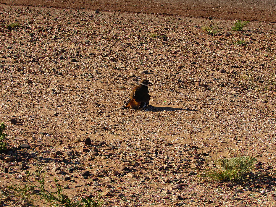 Killdeer (also called sandpiper). When they pretend they're injured like this, it means they have eggs nearby they're trying to distract you from. They're smart enough to do this, but then they lay their eggs on the ground because they look like rocks.