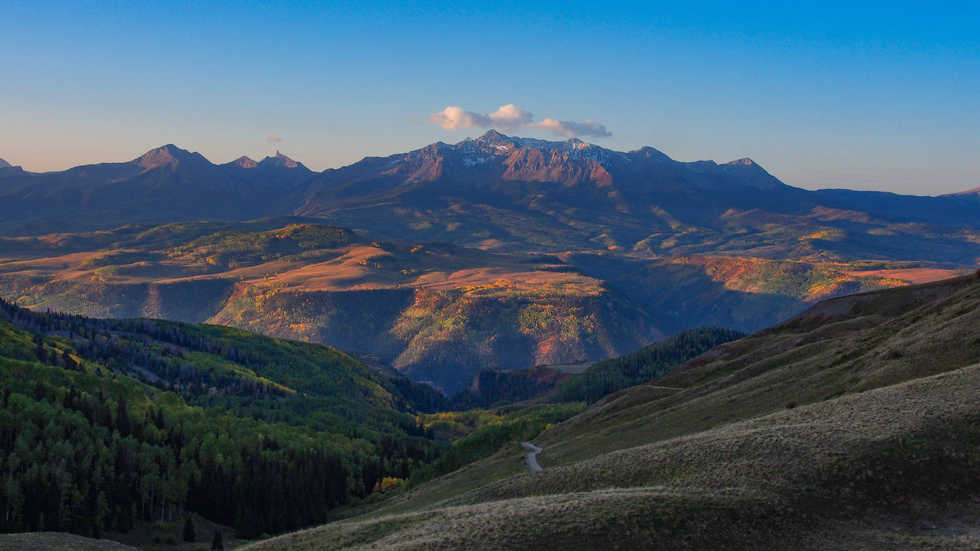 This photo was taken from my campsite at 10,700 ft elevation on Last Dollar Pass looking south as the sun was rising and starting to illuminate the mountains. The San Miguel River valley is at photo center and Telluride is out of sight to the left side of the photo. The highest peak on the horizon at photo center is one of the "Fourteeners", Wilson Peak at 14,017 ft. The brown haze across the horizon is from wild fires in California and Oregon.