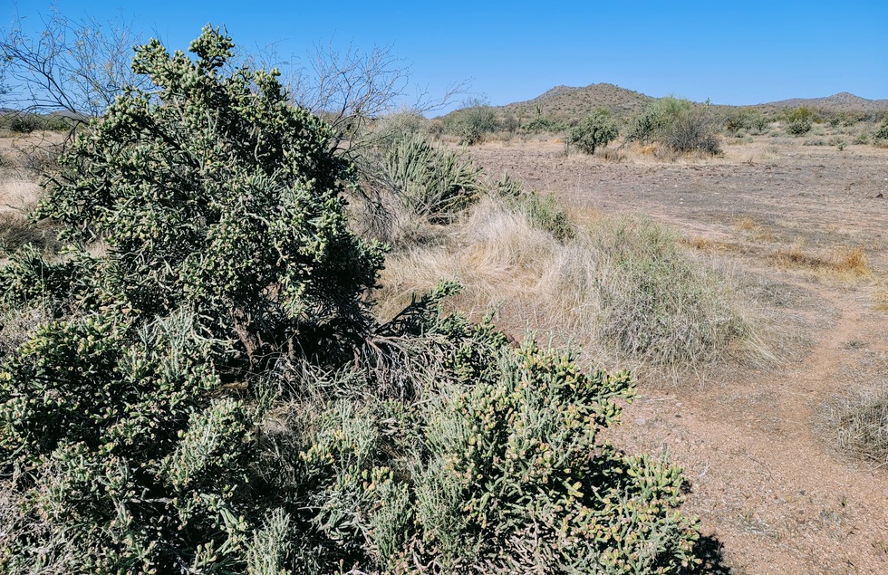 Then I noticed this giant plant that I thot was an extra large Christmas cholla but it actually has a trunk. After some Rx we discovered it was a Arizona Pencil Cholla Tree. And there are other labels on HAZ from bradshaws along this same trail. [ Pencil Cholla ]