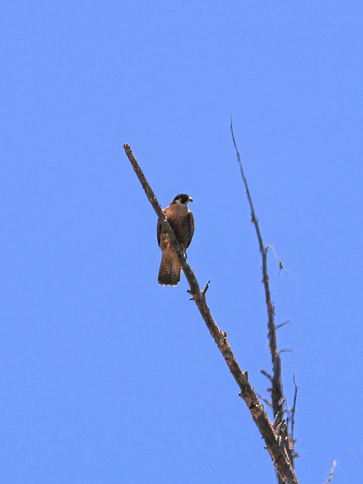 This raptor was flying back and forth high above screeching loudly for at least 20 minutes indicating it probably had a nest high up in the cliffs. It finally stopped and took this perch after we had passed the cliffs. Michael who knows his birds identified it as possibly being a Kestrel after getting back to camp and digging out his Birds of AZ book. We didn't have a clear look at the bird as it kept considerable distance from us. This zoomed photoshopped photo shows details of the bird that we couldn't see at the time. I'm thinking it might be a Peregrine Falcon but am waiting for confirmation from Michael.