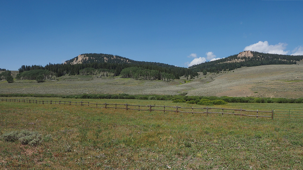 View along the Medicine Wheel Passage Scenic Byway (US 14-Alt). The North Tongue River flows through the strip of trees across photo center. We saw several people fly fishing in the river. Posted signs informed the anglers that catch and release was required except for Eastern Brook Trout.