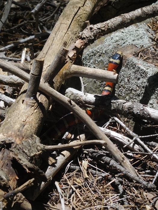 Hiker ahead of us saw this guy crossing the trail. She thought it might be two snakes, but it was just one really long and skinny one. At least 4' long. It was hard to tell since the middle was hidden under branches, but obvious once it decided to slither away.