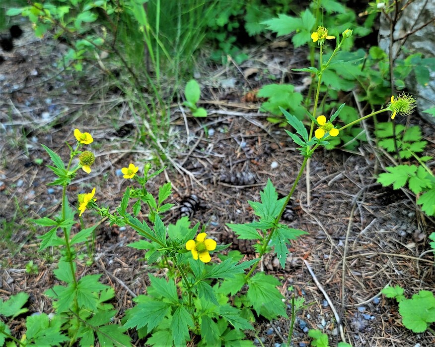 Haven't seen many of these. Geum macrophyllum, commonly known as largeleaf avens or large-leaved avens is a flowering plant found from the Arctic south to the northern U.S. states, and in the Rocky Mountains and west to the Sierra Nevada in California and as far south as Northwestern Mexico.