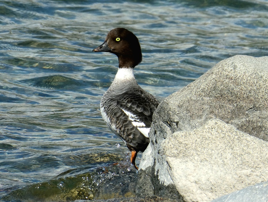 Common Goldeneye: Females have chocolate brown head; gray back, wings and tail; and white flanks, belly, and breast. Immature and eclipse males are difficult to distinguish from females. Both sexes have bright amber irises (hence the name "golden-eye"); irises are more brownish in young.