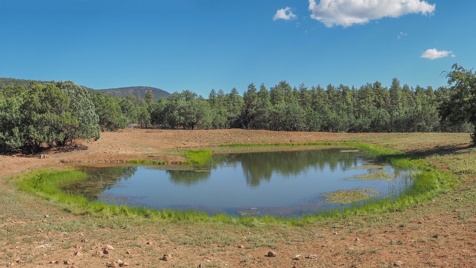 The water in Park Tank was only a few inches below the outlet drainage and it looks like it has been at that level for a month or more based on all the vegetation around the bank. I spotted what looked like two game cameras attached to trees, one on each side of the tank. I was about to fetch GH to put on a show for the cameras when closer examination revealed that they were the semi-theft proof housings for cameras but the cameras weren't there. Oh well, he was already busy setting up his camp.