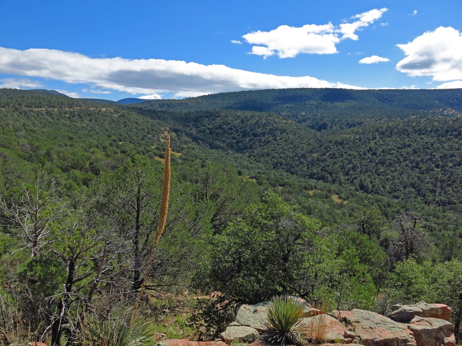 Hiking on FR2750 past the two track that heads down to Thoroughbred Pasture and Tank (see tag note), we headed first off-trail and up to a planned ledge area that would hopefully provide views down into Salome Canyon Creek and views over to JR Ranch and beyond. This off-trail route
