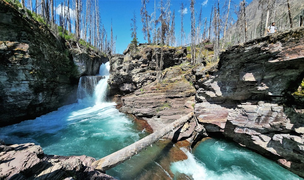 the always beautiful St Mary Falls, despite the burned trees all around.