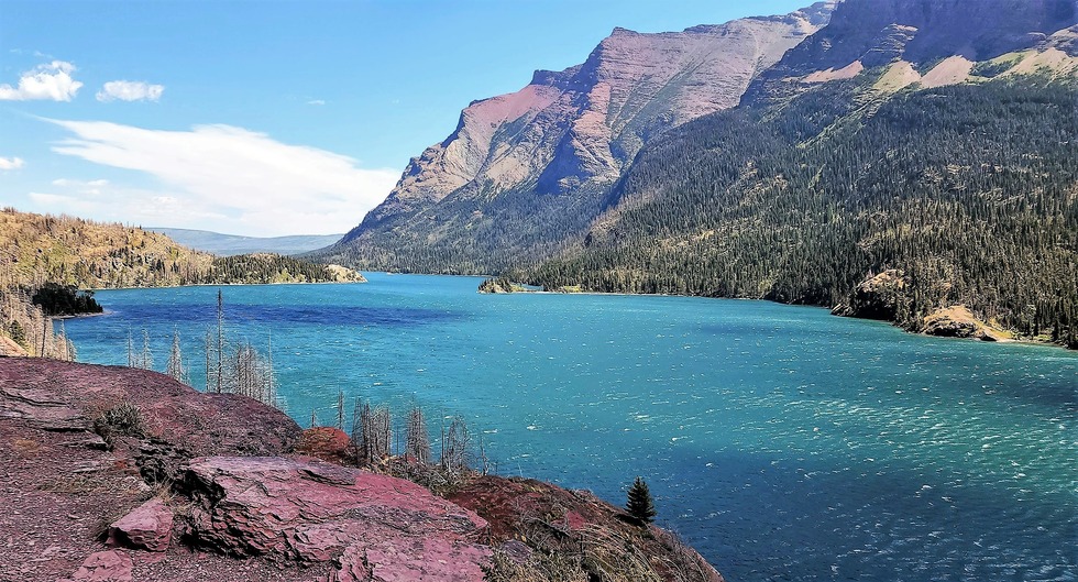 Whitecapping on St Mary Lake is not an unusual but rather it is typical for the most part. I love the red rock below me to the red tint of Red Eagle Mountain. The red rocks are part of the Grinnell Formation, a stack of lightly metamorphosed sedimentary rocks up to 790 meters (2,600 feet) thick. Iron oxide (rust) in the rocks creates the red hue.