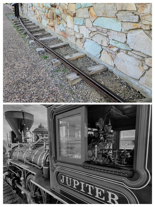 Some of the original track. The VC is made out of this incredible rock: Rock from the Visitors Center is from quarries in Park Valley, UT. The red is ferrous (iron) quartzite and the green is cupreus (copper) quartzite.