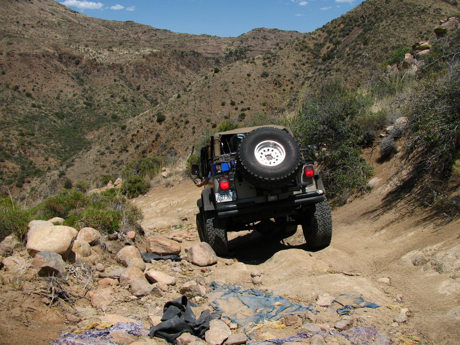 Approx 12.7mls in from Mammoth at 4950' a-top Boulder Mtn begins the serious 4x4 downhill on the legendary "Carpet Hill" (a .7ml drop of 650+ feet) on a loose-rocky, rutted, gnarly, washed-out road with sharp turns too; Then if you are able to safely make it to the creek bottom and you don't intend to drive all the way through (+57 miles) to Hwy 70, you must be prepared to climb back up Carpet Hill; Notice the colorful carpet remnants which have been in place here since the 1950's to aid in traction and help prevent erosion (This pic is courtesy of HAZ-ssk44);