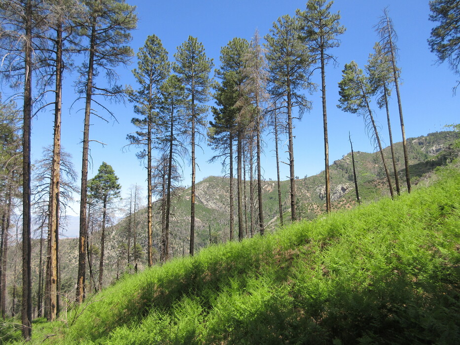 The pole like nature of these Arizona Pines demonstrates the stocking density the previous forest had achieved. They have extensive fire damage to the stem with missing bark, but they survived the Bullock (2002) and Bighorn (2020) and could provide seed for reproduction.