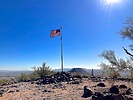 Clockwise, Arrowhead Point Trail climbs 270 ft., is relatively flat for 200 yds., then climbs a short — but steeper — 120 ft. to the summit. Both climbs are very rocky, with multiple step-ups. The summit had Old Glory, a couple stools built of rock slab resting on gabions, and no shade.
