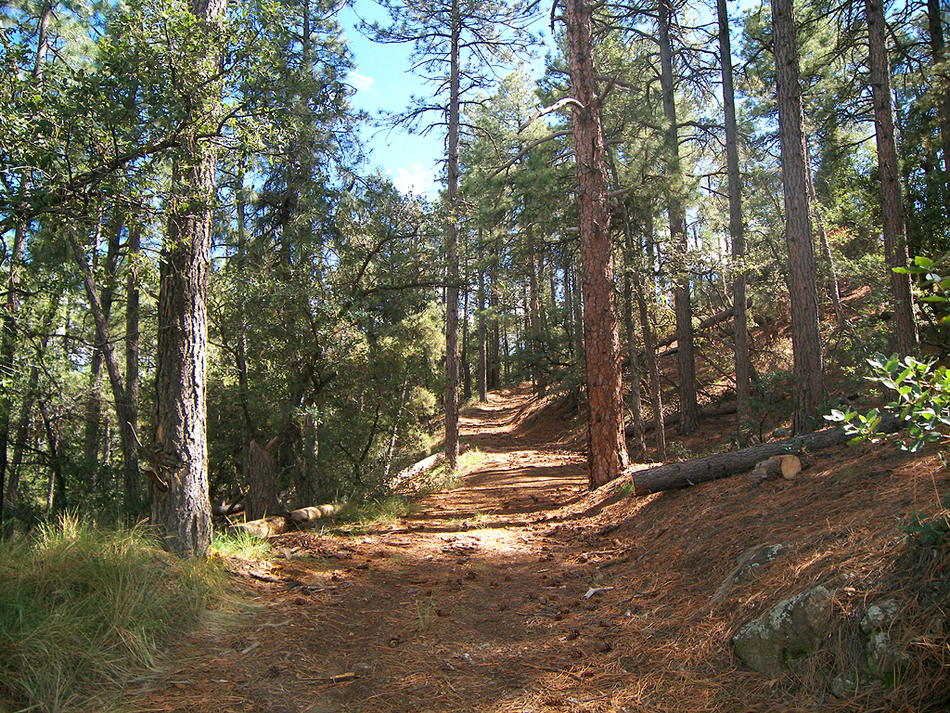 For the next mile, the road climbs steadily, all the while immersing you in increasingly wonderful views of Globe, Miami, and distant mountain ranges. The rounded summit of Madera Peak looms high above, with its rich carpet of ponderosa pines. As you climb higher, the vegetation changes from scrub oak to manzanita, with some ponderosas on the north-facing slopes. Around the 5500 foot contour, the road starts its first wickedly steep pull, that terminates on a little pine-covered bench, where a couple of small campsites can be had. Now the road jogs west and soon lands on a ridgeline, which it follows to a hilltop at 6200 feet. From this lofty vantage point, one can now see the forested bowl of upper Steven's Gorge, the Superstition Mountains, and the lush, rolling green mountain tops of the western Pinals. The road becomes a bit more primitive as it rolls along the lightly forested ridge top and soon makes a steep drop to a saddle at the base of Madera Peak itself. Now the road begins a second wickedly steep climb, straight up the pine-clad north face of Madera Peak. It's really more like a snow-less black diamond ski run covered in loose pebbles. Spectacular top-of-the-world views provide a distraction, though. After a 500 foot climb in only a quarter of a mile, the road suddenly reaches the top, next to a lone tv tower. This is a false summit, the actual top of Madera Peak is a short distance to the south. From the tower, you can look down the mountainside and see how far you've come. Continue following the now greatly improved road to a road junction in a saddle, just 0.1 miles to the south. Turn left at the yield sign onto an old pine needle covered road, and follow it a short distance through the tall pines to an open area at the top of Madera Peak. At the end of the road, you are greeted by some weathered concrete footings with a large oak tree growing in the center. These are the remains of Madera Peak's 40-foot tall wooden fire lookout tower. Nestled among some rocks at the base of the oak tree is a half-rotted summit register in a glass jar. Views from the top of the peak are limited, due to the forest. Once you have had your fill of this sky island, head back down, and be careful on those steep sections. They are especially treacherous coming down! 2020-12-10 The current Official Route does not follow the original 21-point flight pattern. If you are able to follow the above guide and record the journey, please post the route. Gate Policy: If a gate is closed upon arrival, leave it closed after you go through. If it is open, leave it open. Leaving a closed gate open may put cattle in danger. Closing an open gate may cut them off from water. Please be respectful, leave gates as found. The exception is signage on the gate directing you otherwise. Check out the Official Route and Triplogs. Leave No Trace and +Add a Triplog after your hike to support this local community. | ||||||||||||||||||||||||||||||||||||||||||||||||||||||||||||||||||||||||||||||||||||||||||||||||||||||||