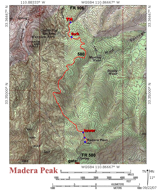 have some Madera by PrestonSands This description is of a hike to the top of pine-covered Madera Peak, which forms the northwestern corner of Arizona's Pinal Mountains. The hike follows a barricaded and incredibly steep 4x4 access road from the Warnica Springs Campground near Miami to the peak's 6647-foot summit. Although the climb up is tough, the hike's outstanding and unceasing views of all of central Arizona are more than enough reward. Hikers will earn their peak bag on this one.The option for a shuttle hike exists if you follow forest road 580 south from Madera Peak to forest road 651 (the road to Pinal Peak).