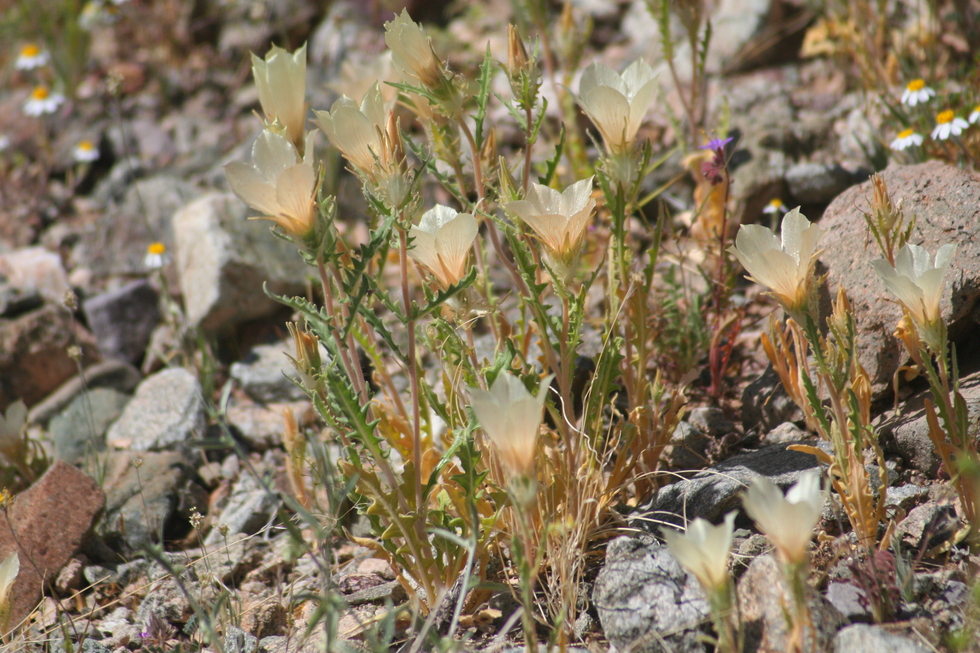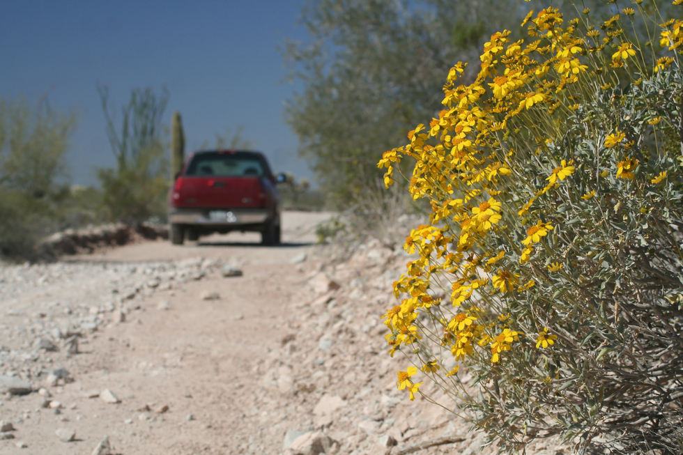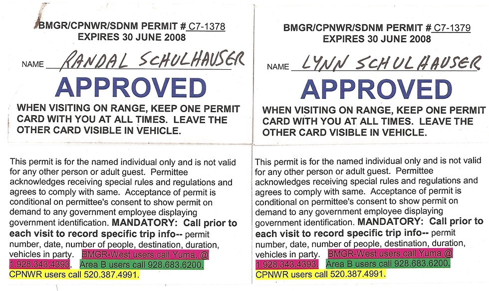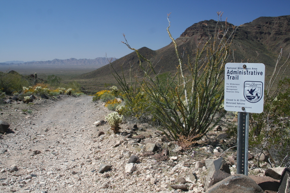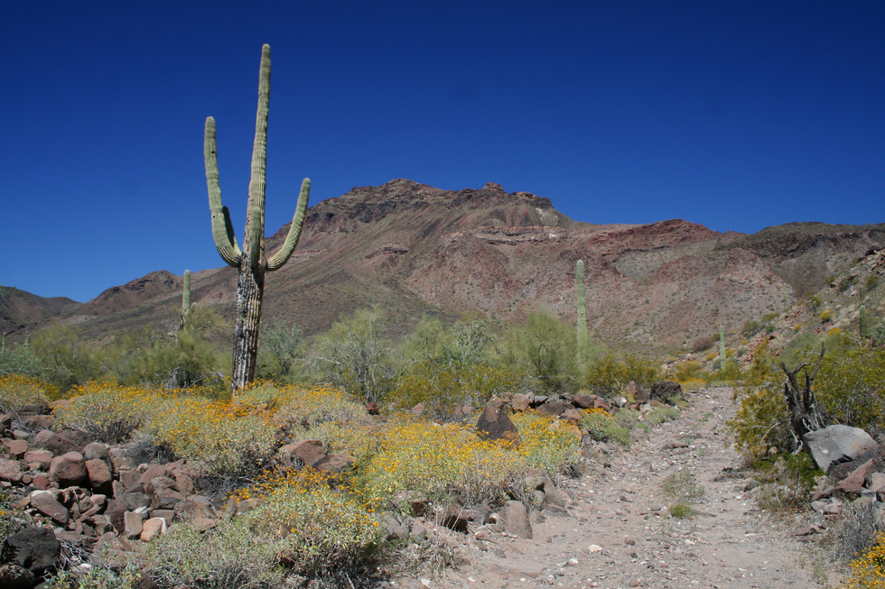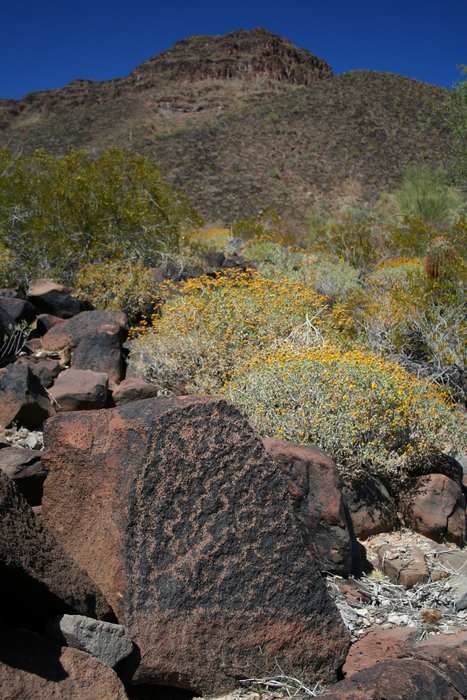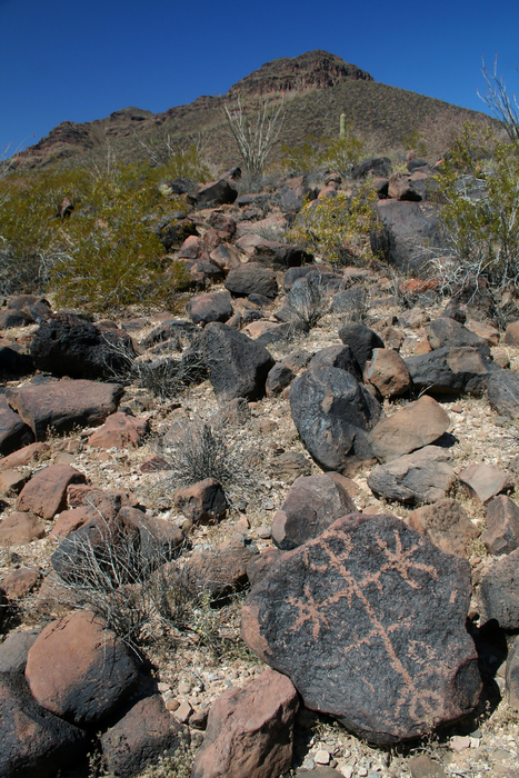 In 1975, this Game Range was renamed the Cabeza Prieta National Wildlife Refuge, becoming the 3rd largest refuge in the United States. Who was Charlie Bell? He's presumed to be a local rancher in which the name-sake pass and well are named after. I couldn't track down any specific information, and NWR Rangers and Volunteers didn't know. I didn't notice any homestead ruins or foundation remains when we explored the petroglyphs around Charlie Bell Well. I did turn up information on rancher Charlie Bell from the Sedona/Wet Beaver Creek area. Could they be one in the same person? Check out the El Camino del Diablo for additional information and history. Check out the Bell Trail for Charlie Bell reference. Hike Having obtained the necessary permits and signed a "Hold Harmless" agreement at the Cabeza Prieta NWR Office in Ajo, travel 1/4 miles north on Hwy 85 until you reach Rasmussen Road. Travel west along Rasmussen Road, which will eventually become Charlie Bell Road. Having traveled about 4.25 miles from Hwy 85, you will come to the Cabeza Prieta Wildlife Refuge boundary. Cross the cattle guard and enter the wildlife refuge. Childs Mountain dominates your view to the north. You should be able to spot brilliant white radar installations on Childs Mountain. This is a reminder of the interwoven coexistence between National Wildlife Refuge and the Department of Defense. I found it interesting that when we stopped to check out some wildflowers, a cactus wren chirped its displeasure while a jet fighter screamed overhead. As you pass between the gap of Childs Mountain (to the north) and Cardigan Peak (to the south) you enter an area with an extensive stand of wildflowers and lush saguaro forest. At about 5.25 miles from Hwy 85, Charlie Bell Road will veer sharply to the south following a wash. At about mile 7.5, you will reach a Y-intersection with Copper Canyon Loop Road. The sign will point you west along Charlie Bell Road towards a windmill and well. At about mile 8.0, you will reach Little Tule Well (There is a Tule Well along El Camino del Diablo further west...). This is also where we had our "alien encounter". As you leave Tule Well, the saguaro forest will begin to thin out being replaced by hedgehog and barrel cactus. We were fortunate on this mid-March day as many cacti were beginning to bloom. Near mile 11.0, you will notice a small hill to the south with an observation blind at its crest. This is Pack Rat Hill, where an ongoing Sonoran Pronghorn wildlife management operation is in progress. You will notice a black tarpaulin radiating from the hill a parallel to Charlie Bell Road. This is a one-square-mile semi-captive breeding enclosure to help re-establish the Sonoran Pronghorn population. The 2002 drought wiped out 80% of the Sonoran Pronghorn population leaving only 21 animals within the refuge. Until further notice, portions of the refuge will be closed to protect the Sonoran Pronghorn during the fawning season. This includes Charlie Bell Road. In 2007, the closure was from March 15th to July 15th. For 2008, fawning season closures will be from April 15th to July 15th. As you travel west of Pack Rat Hill, take note of the wash crossing the road and spot a rare crested saguaro immediately to the south of Charlie Bell Road. Open grassland dominates the topology, and the road soon changes from the rough rocky gravel to sandy conditions. This creates ideal conditions for the Ajo Lily. At mile 14.5, Charlie Bell Road will pass Daniel's Arroyo Road (no public access), and at mile 15.0, it will pass Jack's Well Road (no public access). Charlie Bell Road will slowly climb Daniel's Arroyo. You will notice a gap in the Growler Mountains to the west. This is Charlie Bell Pass. Near mile 16.5 you will crest Charlie Bell Pass. Trail Head parking is available if you wish to explore the many petroglyphs within Growler Valley. The volcanic soil in this area seems to stimulate Sonoran flora. Although the double track continues west from Charlie Bell Pass, vehicular access is restricted. This will serve as our hiking trail into Growler Valley. If you hike about 3/4 miles along the trail, you will lose about 275 feet of elevation and reach what appears to be the valley floor. The trail now descends more gradually, following a wash strewn with large boulders. Turn around and catch Growler Peak dominating your view to the north. Having hiked almost 1.5 miles, the windmill at Charlie Bell Well will appear. Take note of the boulders with black desert varnish to the windmill's right (i.e., North). Upon closer examination you will notice many are covered with petroglyphs! As I boulder hopped up this wash, more and more petroglyphs came into view! I noticed that the wash forked into two separate drainages. Both contained petroglyphs. Although there are boulders with black desert varnish to the south of the windmill, petroglyphs were sparse. My recommendation is to further explore upstream to the north... Summary This is a great introductory hike to the Cabeza Prieta National Wildlife Refuge with various Sonoran Desert flora and fauna. And don't forget the rock art... Enjoy! Check out the Official Route and Triplogs. Leave No Trace and +Add a Triplog after your hike to support this local community. | |||||||||||||||||||||||||||||||||||||||||||||||||||||||||||||||||||||||||||||||||||||||||||||||||