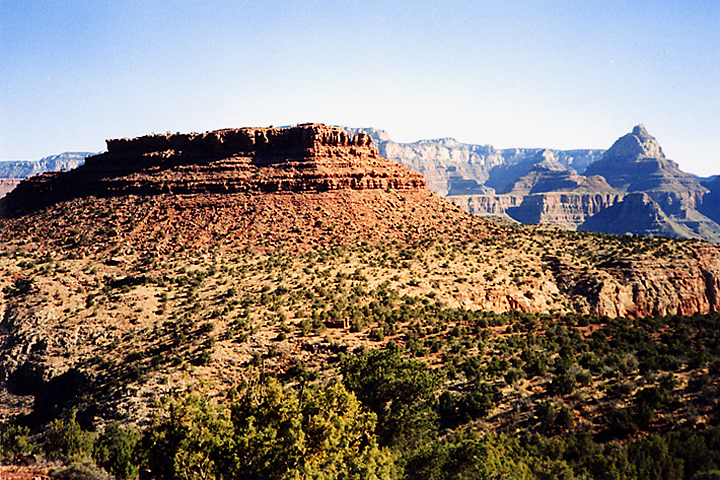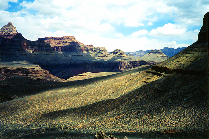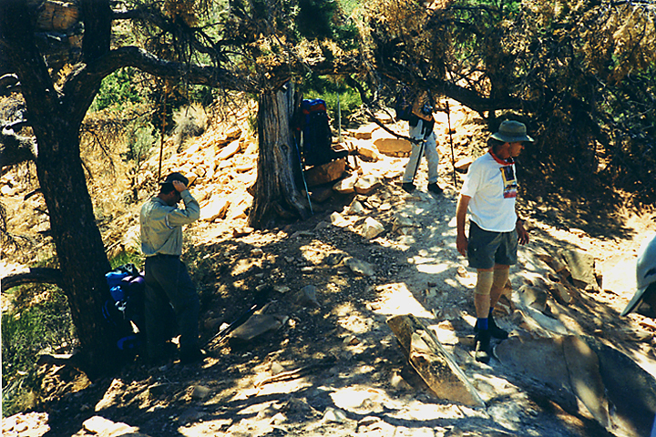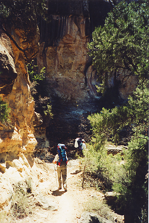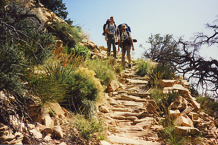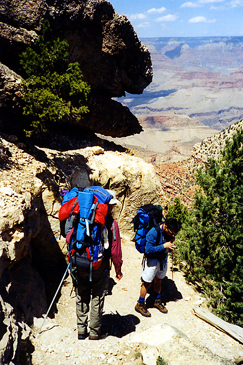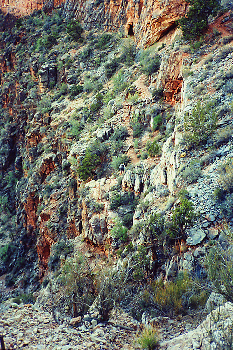 Caves, Mines, and History by PrestonSands The Grandview Trail was built in 1892 to reach the rich "Last Chance" copper mine on Horseshoe Mesa. Much of this steep trail was covered in tightly fitted cobblestones, some of which can still be seen today. Mule trains would bring copper ore up to Grandview Point, where there was a processing mill. Horseshoe Mesa makes a great destination for either a day hike or a backpacking trip; I was 12 years old when I first hiked this trail with my dad.The trail begins at Grandview Point on the south rim of the Grand Canyon, about 10 miles east of Grand Canyon Village. The trail immediately begins descending the Kaibab Limestone cliff through a series of switchbacks blasted into the rock. Stacked wooden logs support some parts of the trail. At the base of the Kaibab wall, the trail levels off for a way as it wraps its way around an island of rock. Once on the east face of the island, the trail drops through the Coconino Sandstone via cobblestone covered switchbacks. At the base of the switchbacks is Coconino Saddle, a notch in the cliffs that makes a fine rest stop. To your right (south), there is a nice view of Sinking Ship and upper Hance Creek canyon. Below Coconino Saddle, the trail descends into the red rocks of the Hermit Shale and the Supai Formations. Enjoy the shade on these next switchbacks; soon after, you will leave most of the trees behind. Along the next couple of miles to Horseshoe Mesa, the original trail has been covered over by rock slides, but the trail is not hard to follow.