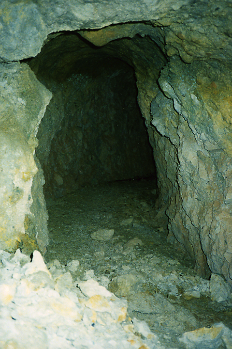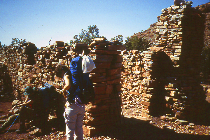 After passing the junction with the Miner's Spring Trail, the Grandview Trail arrives at the old stone miner's dining hall. The campgrounds are near here, just east of the trail. There were several cabins on this mesa during the mining days, and there are rusty relics scattered everywhere. The Grandview Trail continues northwest from the old stone building, passing on the west side of the rocky butte at the center of Horseshoe Mesa. Where the trail crosses a small drainage due west of the butte, you will see a faint side trail following the drainage down to the edge of the cliff. This is the trail to The Cave Of The Domes (Horseshoe Mesa Cave). At the cliff's edge, the side trail turns right (north) and quickly arrives at the entrance to the cave. This is a fairly good-sized cave, characterized by short sections of crawl spaces, which open up into dome-shaped rooms. Many of the caves' stalactites were broken off by early 20th century tourists and brought up to the South Rim. Some formations are still there, though. Towards the back of the cave, there is a large 30 foot tall hallway, with some bacon-like formations on the walls. Beyond the junction with the cave trail, the Grandview Trail continues out to the northwest arm of Horseshoe Mesa. It was on this stretch where we encountered some fierce winds on a 2002 backpacking trip. I was carrying a 70-pound pack and was almost blown off the trail. Now at the edge of Horseshoe Mesa, the trail begins a mile-long descent through the Redwall Limestone to the Tonto Trail below. This is the official end of the Grandview Trail. However, I have read that the trail originally continued down to the Colorado River in the early 1900s. History: Impressions of the dazzling topography of Grand Canyon have changed and shifted since that day in the summer of 1540 when Garcia Lopez de Cardenas gazed out from the South Rim. The conquistador saw a worthless desert wasteland, nothing more than a barrier to political expansion. At the opposite extreme, the modern view tends toward the romantic, reveling in what we today perceive as the remarkable spirituality of the gorge. Products of the age in which they lived, American pioneers arriving in the 1890s were more practical and utilitarian: they assumed with so much exposed bedrock inevitably there had to be mineral riches waiting to be claimed by those willing to go below and look. Would-be miners fanned out across the inner canyon, probing everywhere, and at a place called Horseshoe Mesa found what they sought. Rich copper deposits initially averaging 30% pure promised wealth, but only if transported from the depths. Optimism reigned supreme, a route was scratched out, and in February 1893, an endless succession of mule trains began moving raw ore to the rim along a rough canyon track originally known as the Berry Trail, more recently as the Grandview Trail. More than any other canyon trail, the Grandview is steeped in the legacy of the mining days at Grand Canyon. Numerous small artifacts associated with these halcyon days are scattered across the top of Horseshoe Mesa, providing a link across the years. Hikers can inspect the physical remains of this bygone era while enjoying canyon scenery at its finest. Grand Canyon NPS Details The original Grandview Trail was created to connect the rim with the copper mines on Horseshoe Mesa. The well built trail eventually provided access to more tourists than miners, as the Grandview trail provided one of the best access routes into the canyon for its time. The undamaged segments of the pioneer trail in the upper half of the canyon testify to the engineering prowess of the builders as they devised solution after creative solution to the problems posed by the landscape. Start off the rim from the established Grandview Point overlook. The Kaibab/Toroweap section traverses steep ground and the old trail is eroded so attention to the problems at hand is essential. Vertical steps were surmounted by construction of log "cribs" that were chained or pinned to the cliff face to provide a foundation for the trail where nature provided none. The exposure here impresses some hikers as hazardous. Unfortunately, several of the historic cribs were swept away by landslides during the winter of 2005. Trail crews restored the trail, but not the historical context of the old logs. A series of sloping ledges at the top of the Coconino cliff demands caution especially when icy or wet. Be careful throughout the Kaibab and Toroweap - a fall here could have catastrophic consequences. Original "cobblestone riprap" trail construction shows throughout most of the Coconino. Large slabs of sandstone placed edgewise provided a durable (albeit labor intensive) walking surface. The trail comes to the top of a dramatic east-facing gully at Coconino/Hermit contact (known locally as Coconino Saddle) that offers tantalizing views into the upper valley of Hance Creek. Steep cobblestone switchbacks below Coconino Saddle dispense with most of the Supai Formation before the walking moderates and the trail begins a gradually descending traverse across the slope to Horseshoe Mesa. Horseshoe Mesa offers a myriad of attractions. The campsites are located east of the historic masonry structure. Remnants of mining operations, including rusty cans, nails, tools and structures are protected as archeological resources. Please leave these objects as you found them, where you found them. Backpackers headed deeper into the canyon can choose between three trails that link the rim of Horseshoe Mesa and the Tonto Trail. The northernmost trail that descends the east side of the western arm of the "horseshoe" is the most civilized of these options. Most of the original switchbacks have survived so this route is relatively straightforward, intersecting the Tonto Trail north of Horseshoe Mesa. Hikers can continue along the Tonto about 1.5 miles west to Cottonwood Creek or about 2.2 miles east to Hance Creek. The trail down the we