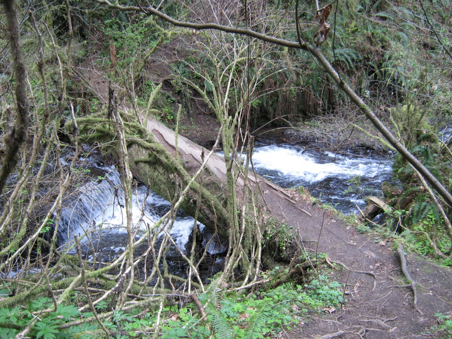 Please DO chase this waterfall by Dano Once you arrive at the signed parking lot, be sure to hide and secure your valuables. The morning I was there I saw evidence of a robbery, the remains of a car's smashed window. The lower falls can be viewed right from the lot behind an interpretive sign. To get a closer view, walk down the short, paved path to the base of the lower falls. The other viewing area is to the left and just up the hill about 30 yards, and this is the way to begin the loop counter-clockwise. The trail ascends up and away from the creek, but then quickly returns to the East side of it. After about 1/2 mile there is a log that allows you to cross to the West side, but don't take that path if you want to see the upper falls; besides, the return loop takes you on the West side of the creek.