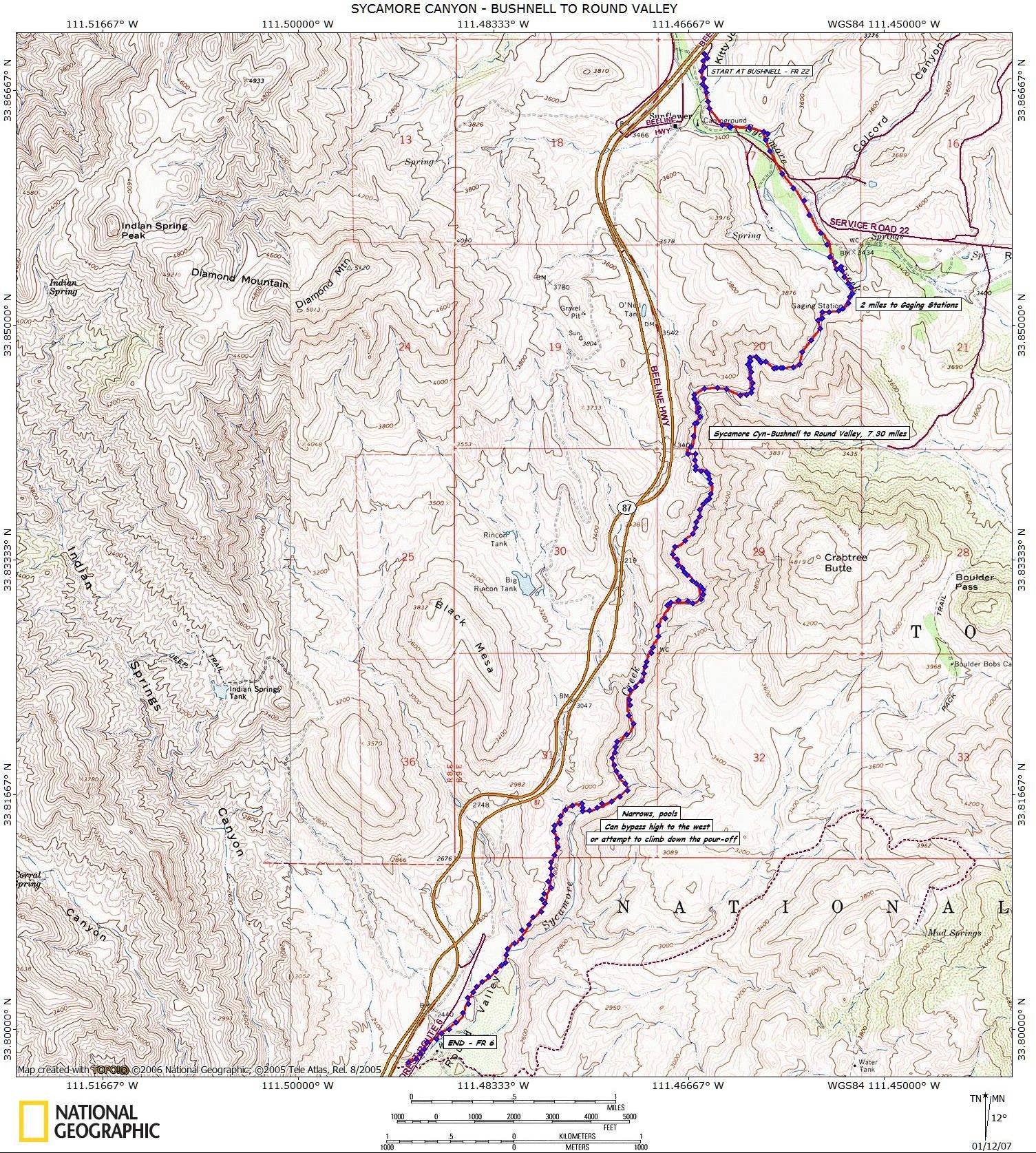 Pools vs. bouldering by hikeaz WarningNarrow canyons are deadly in the event of a flash flood. The 2020 Brush Fire makes this canyon susceptible to powerful flooding through 2024. Prologue For those of you who have hiked the section of the Agua Fria south of Badger Springs, this is a similar hike, only longer. This was an exploratory hike for all of us. We started at the new boondoggle gate at the Bushnell Tanks turnoff from the Beeline. Making our way down the dirt road (FR22), we passed the various campsites that now appear unused. After about 1 mile, we turned off and followed the Sycamore Creekbed instead of taking the road up onto the hillside. Making our way down the creek was a bit tiring.... up onto boulders, back down again, through the catclaw, around the cockleburrs.... repeat.