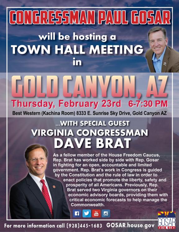 Arizona congressman Paul Gosar has a town hall scheduled for this Thursday, 2/23 in Gold Canyon. Gosar made a showing at the Bundy ranch (in support of Bundy), when that whole fiasco was going down. His latest bill attempts to repeal EPA restrictions on drilling in National Parks. Just wanted to let people know in case you're interested in such things.