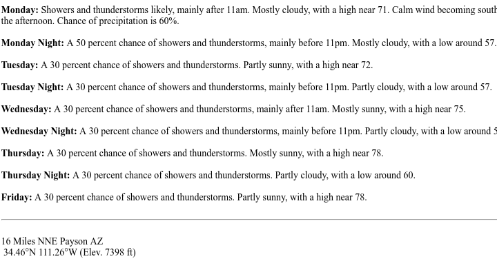 Welcome to Arizona in July. Exact forecasts are hard to come by as we are in the monsoon season. In general you should plan for the possibility of showers and thunderstorms between noon and 2AM, and following a storm it will cool off, but be more humid.