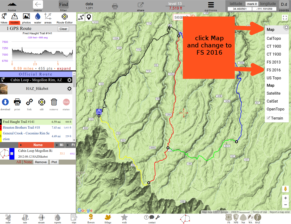 Switch the layer to FS 2016 so you can see the roads Then zoom into the beginning and ending of trails Horizontal Numbered roads are best in high clearance vehicles when dry.