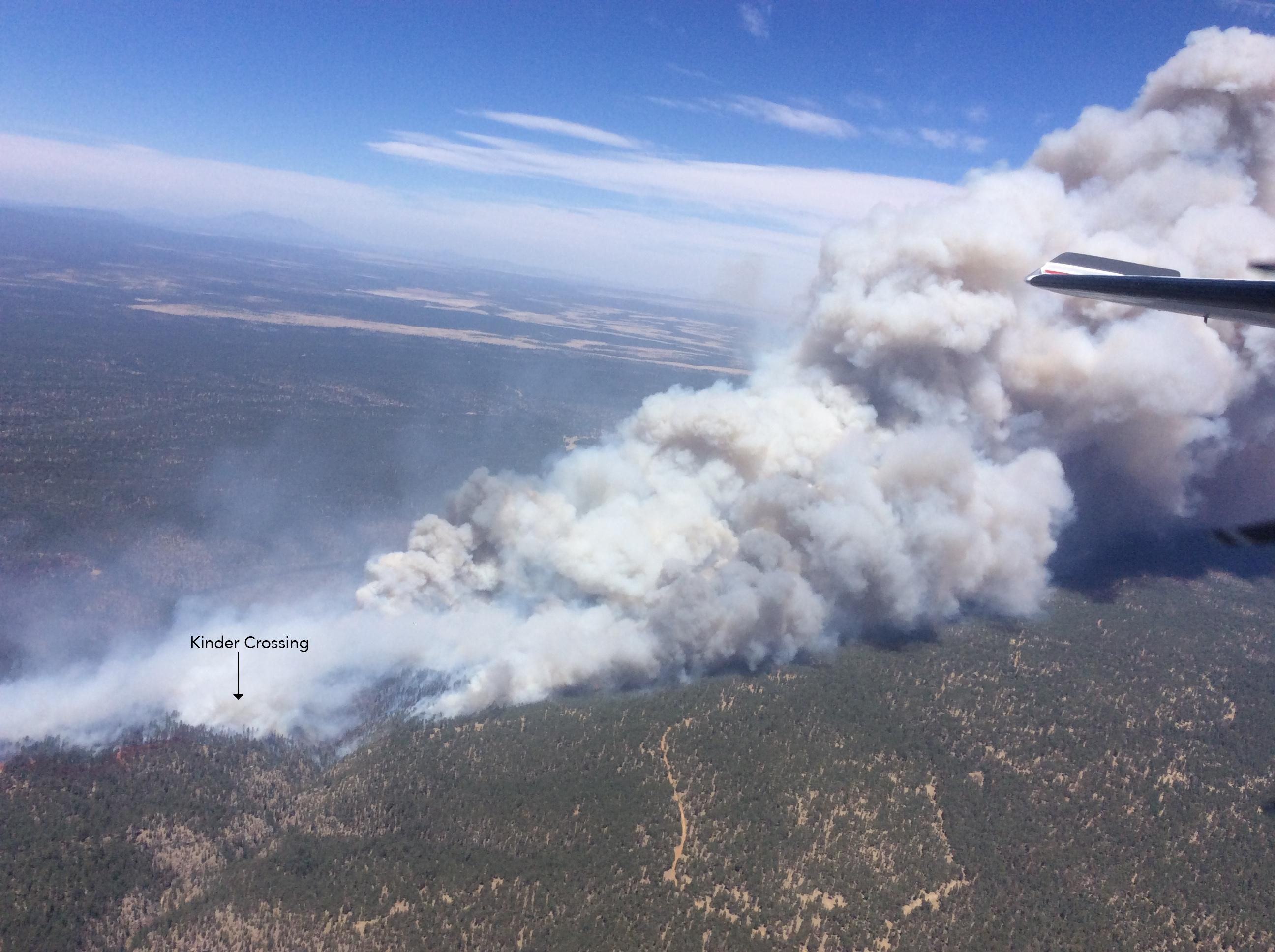 The fire was reported by the Moqui Tower lookout on April 27 at 11:43 a.m. and began near Forest Road 95, approximately 1.5 miles east of C.C. Cragin Reservoir. It quickly spread to the bottom of East Clear Creek Canyon, and strong southwest winds drove the fire in a northeast direction up the canyon and towards private property and residents located about 3 miles away.