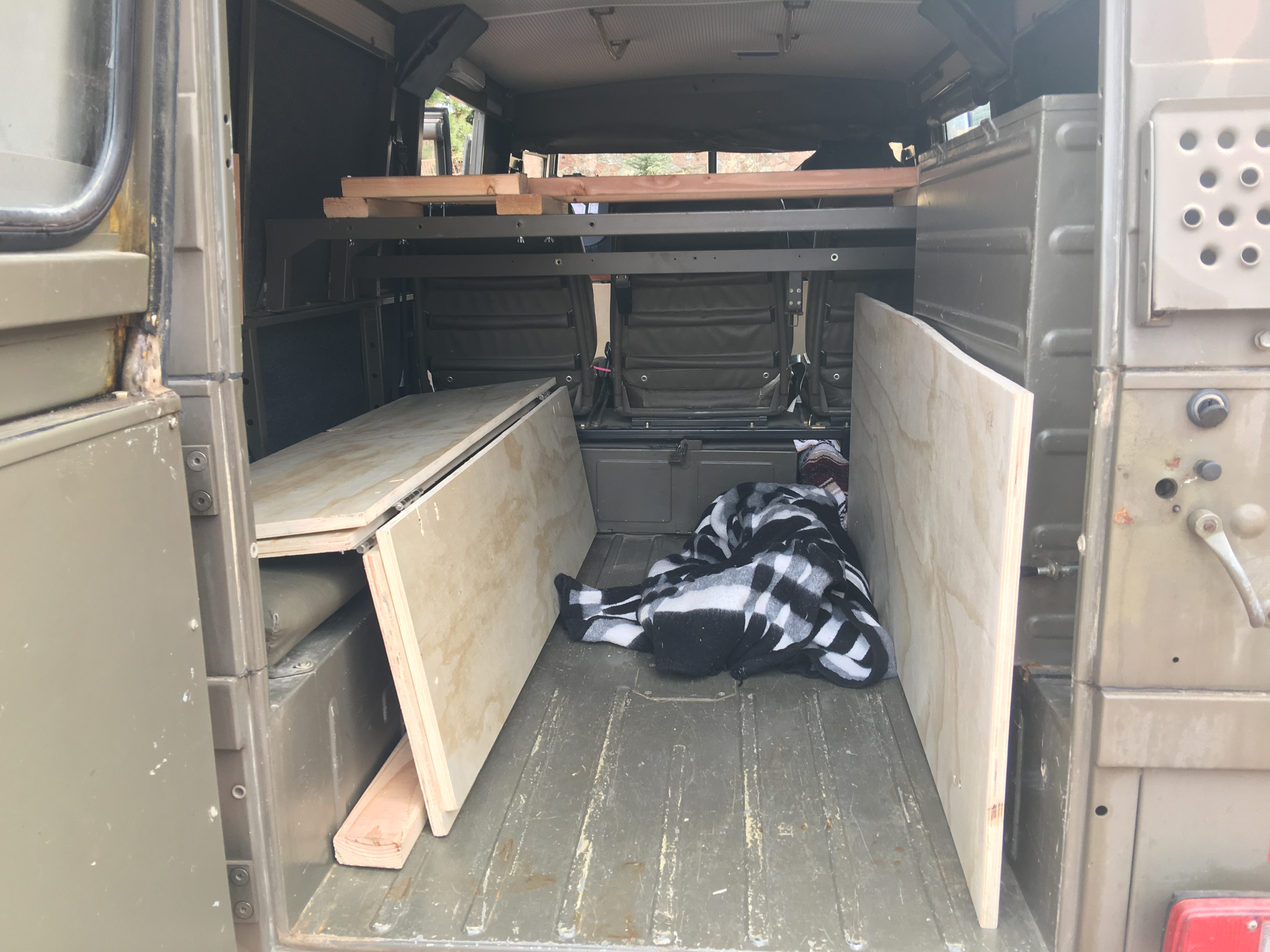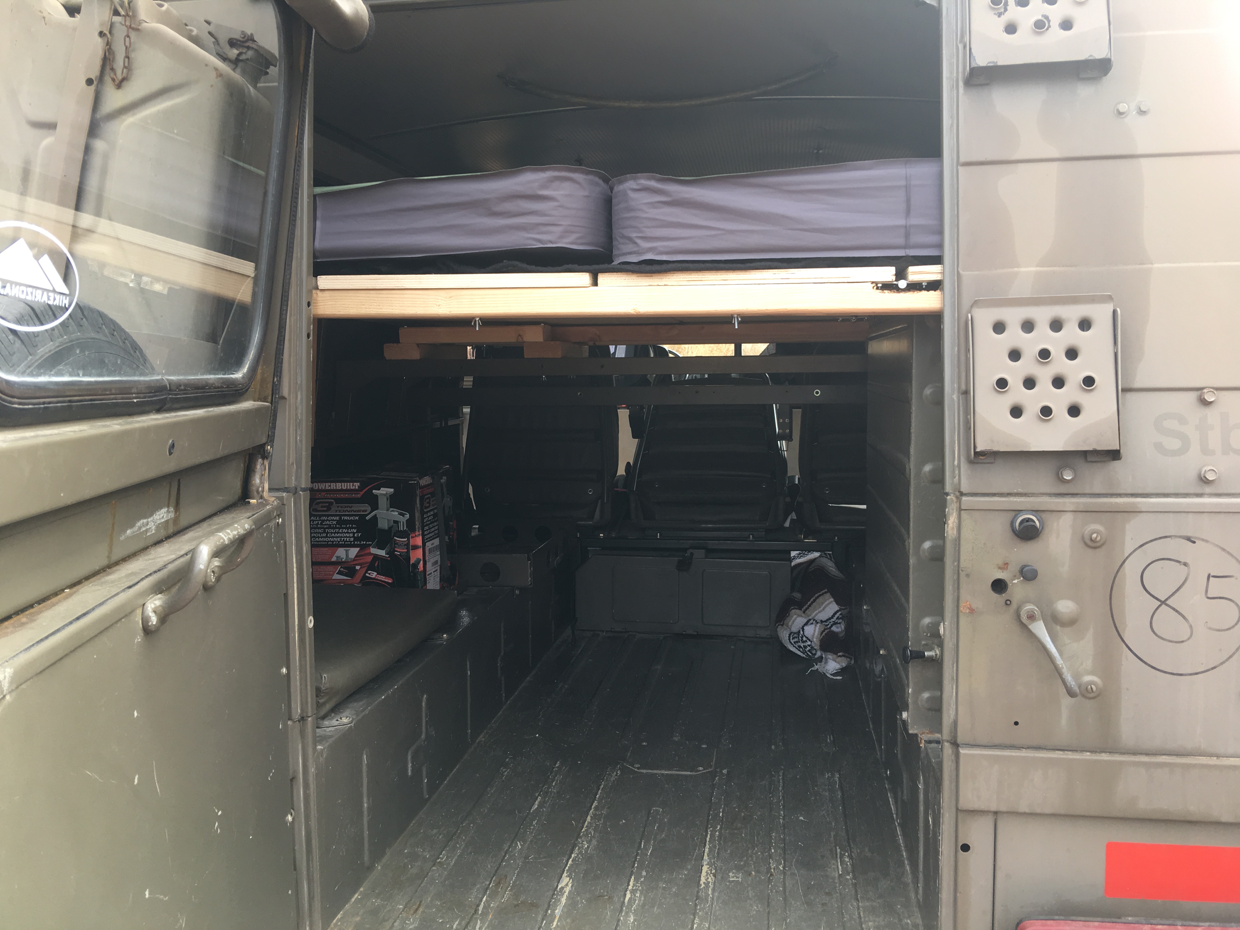 I just built a quick remove platform for Yertle. I can leave the main platform in place, but have to remove kid car seats and add a piece with 4 wing nuts to set up sleeping. Two exped megamats create the sleeping area and Make a queen size spot for my wife and I with 9+ r value. The exped mega mats come in a double as well which is narrower than two put together, but may fit in smaller vehicles.The sides are vertical so two fit together perfectly for our platform. They are self inflating and have memory foam as well. They are heavy, but they aren’t meant for backpacking and they are as comfortable as our bed. We got them on super sale, and have been sleeping on them all summer and they are great. Because of the generator bay and not wanting to remove seating for three there is not room to sit up, but it is pretty comfortable and the air mattresses can be rolled up and the platform used for gear, while still leaving room underneath for the dogs. It’s a work in progress. Because it was a radio truck, it has blackout curtains with Velcro all the way around saving me sewing curtains and the gas heater even makes winter trips comfy. The fold out table with storage underneath means all I have left is to get solar, inverter, and batteries to run an ARB fridge freezer although I think they are efficient enough to run off the 24 volt system already in place. For now the cooler fits in the generator bay. I never really liked car camping, but with little kids we’ve found freecampsites.net to be a good resource for dispersed camping wherever we want to explore. With off-road capability there are great sites almost everywhere. After this years mosquito issues at the dunes and a couple of other spots we camped I also got an awning with a zip in mosquito netting that fits on the rack. In nice weather Bear can sleep there and guard the camp. :)