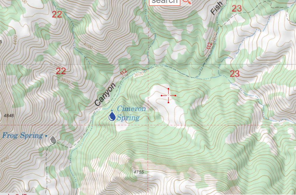 Every time I have been in this area there has been water in Fish Creek drainage a couple minutes downstream from the Froggie. Once back on the trail up to Angel Basin, there is a small campsite a few minutes up on the left side of the trail; between the trail and the creekbed. Larger (but more well-used) sites available at A.B. and above the ruin on the trail to Roger's. A.B. is a cold-sink, so if cold I would avoid - also has more than its share of goat-heads.